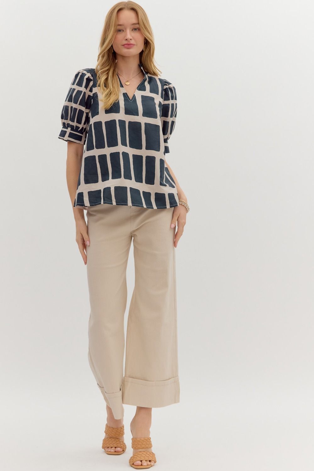 Abstract print band cuff short sleeve pullover top featuring pleated ruffle accent V-neck. Unlined. Woven. Non-sheer. Lightweight.