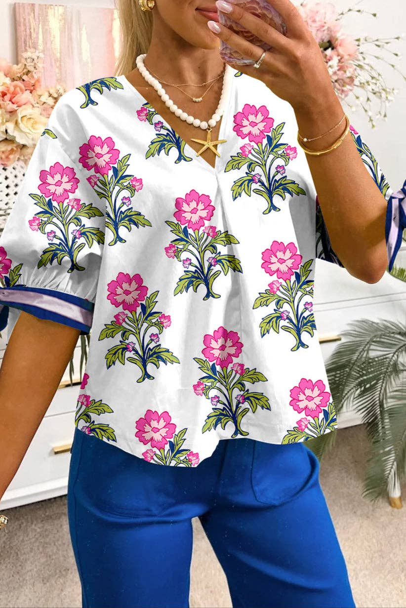 Floral Colorblock V-Neck Summer Short Sleeve Top