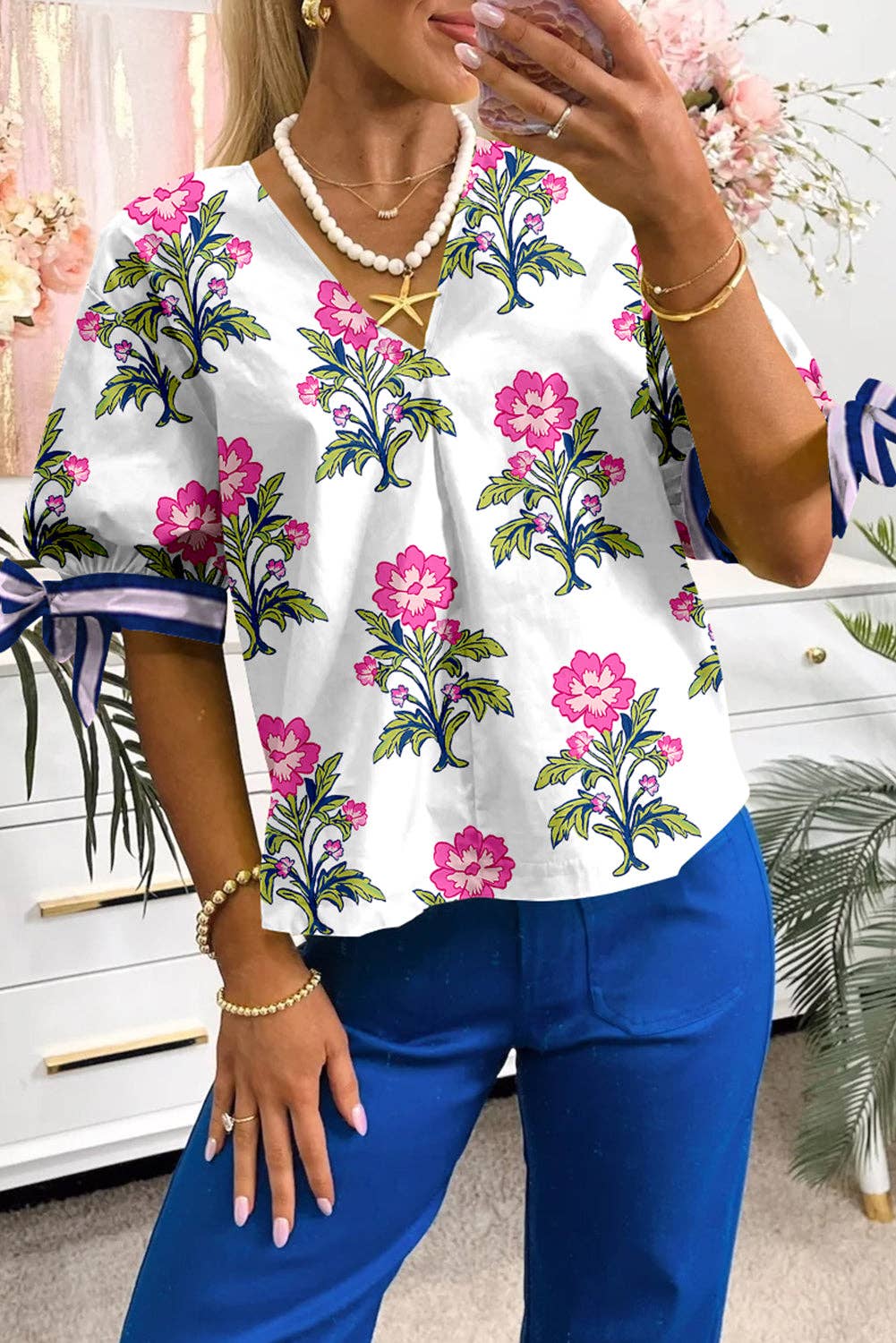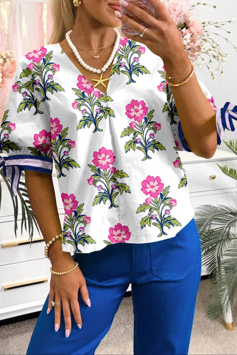 This blouse features a sophisticated blend of vibrant floral and color block patterns, enhanced by a chic striped knot detail. Its bubble sleeves add a playful yet trendy dimension, while the flattering V-neckline elegantly frames the neckline, making it a refined choice for any stylish wardrobe. 100% Polyester