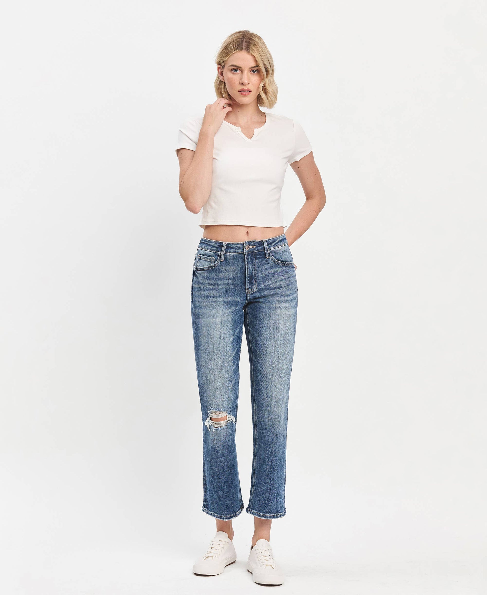 HIGH RISE ANKLE STRAIGHT JEANS COMFORT STRETCH DENIM, HIGH RISE WAIST, DISTRESSED DETAIL, ANKLE LENGTH, STRAIGHT JEANS F. RISE: 10" / INSEAM: 27 1/2" / LEG OPENING: 16"