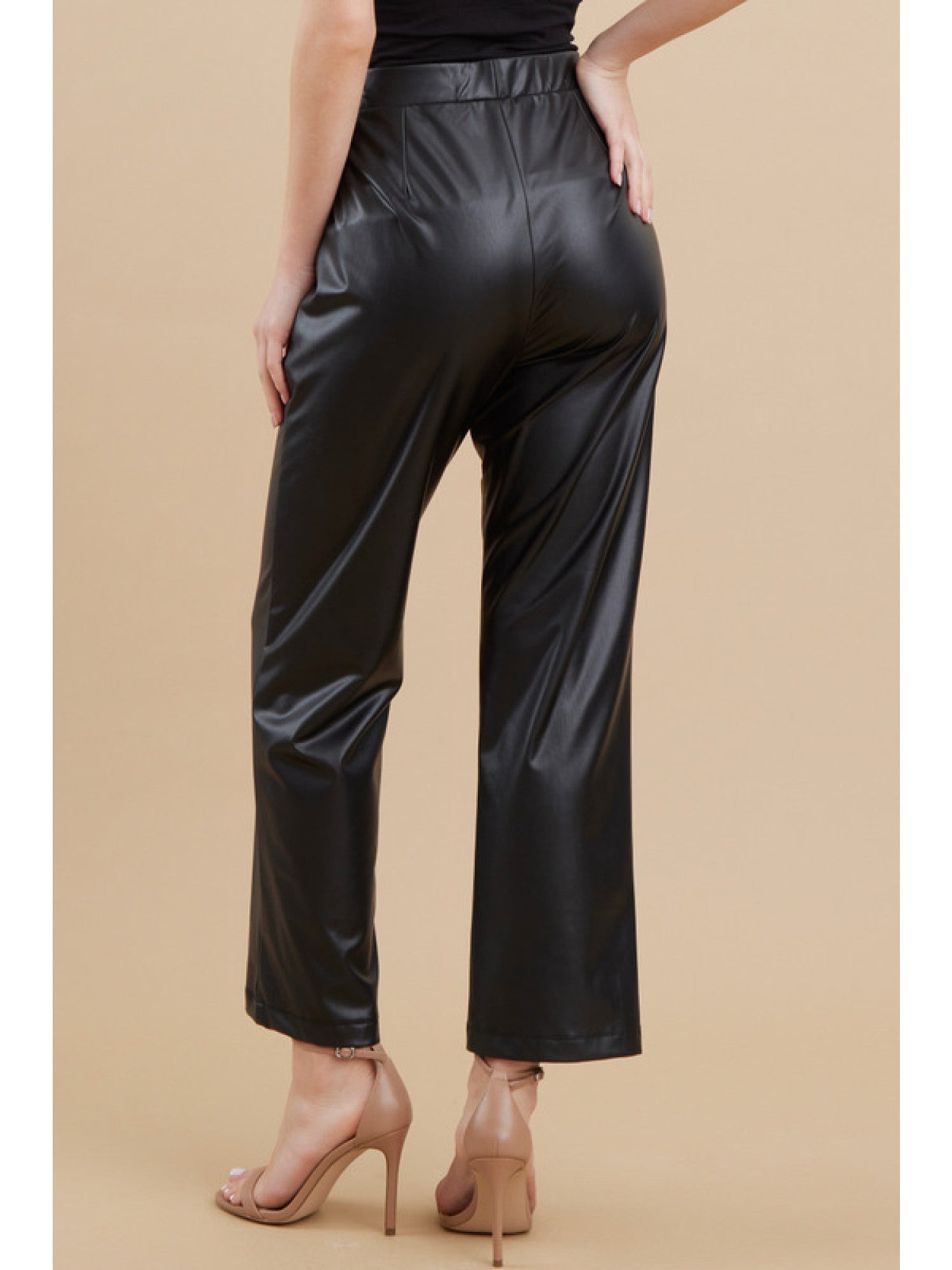 Solid faux leather flare pants with a high waistline and back stretch-band.