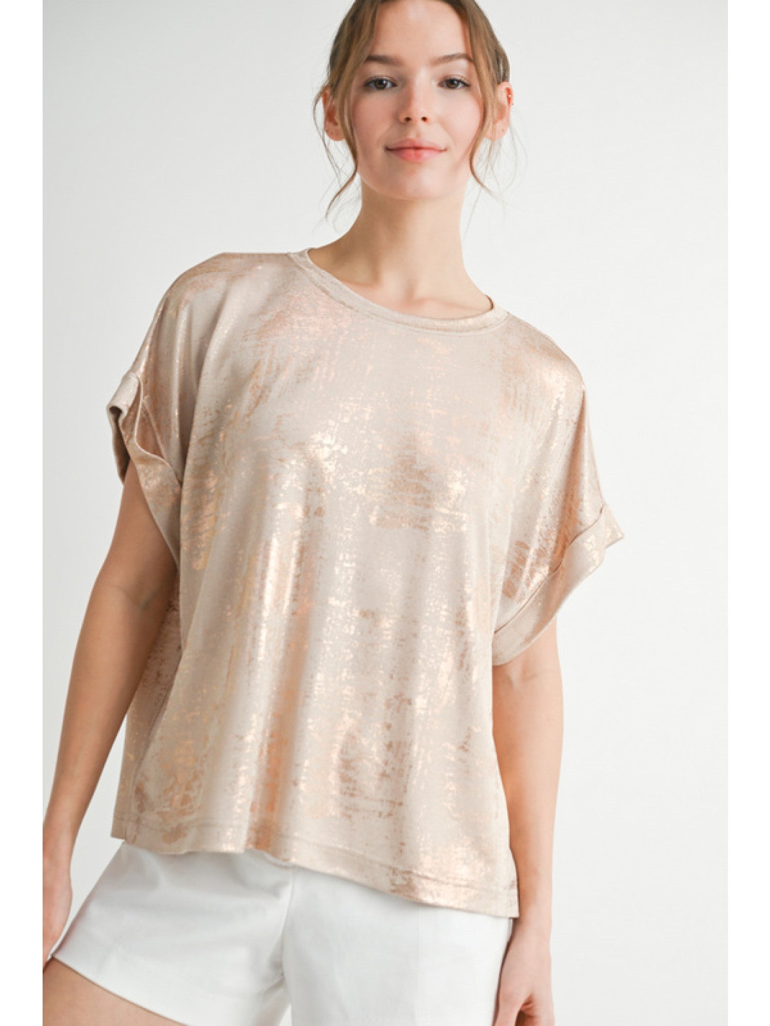 Drop shoulder metallic top with side slit.