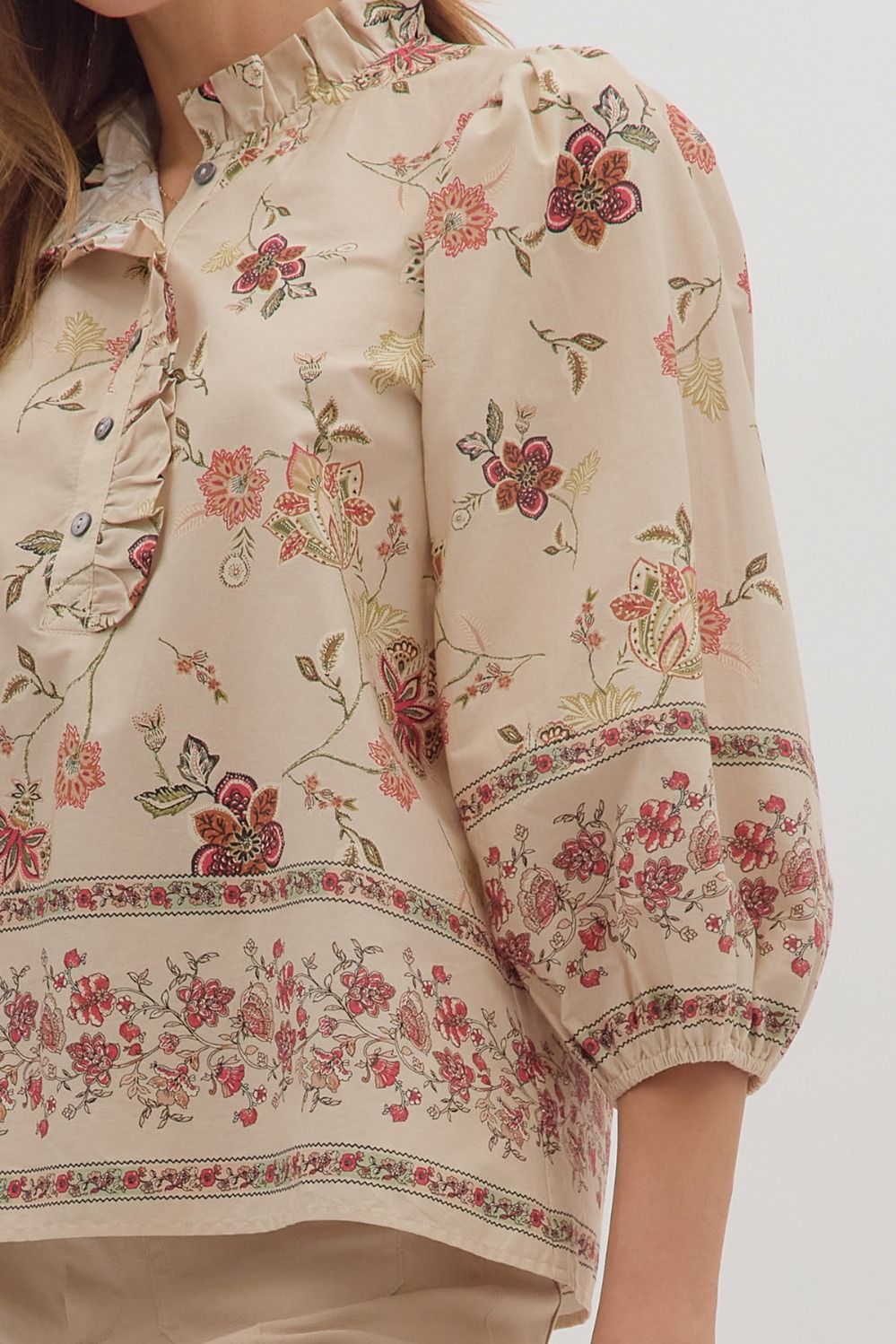 Floral print ruffled split neck 3/4 sleeve top featuring partial button closure at front.