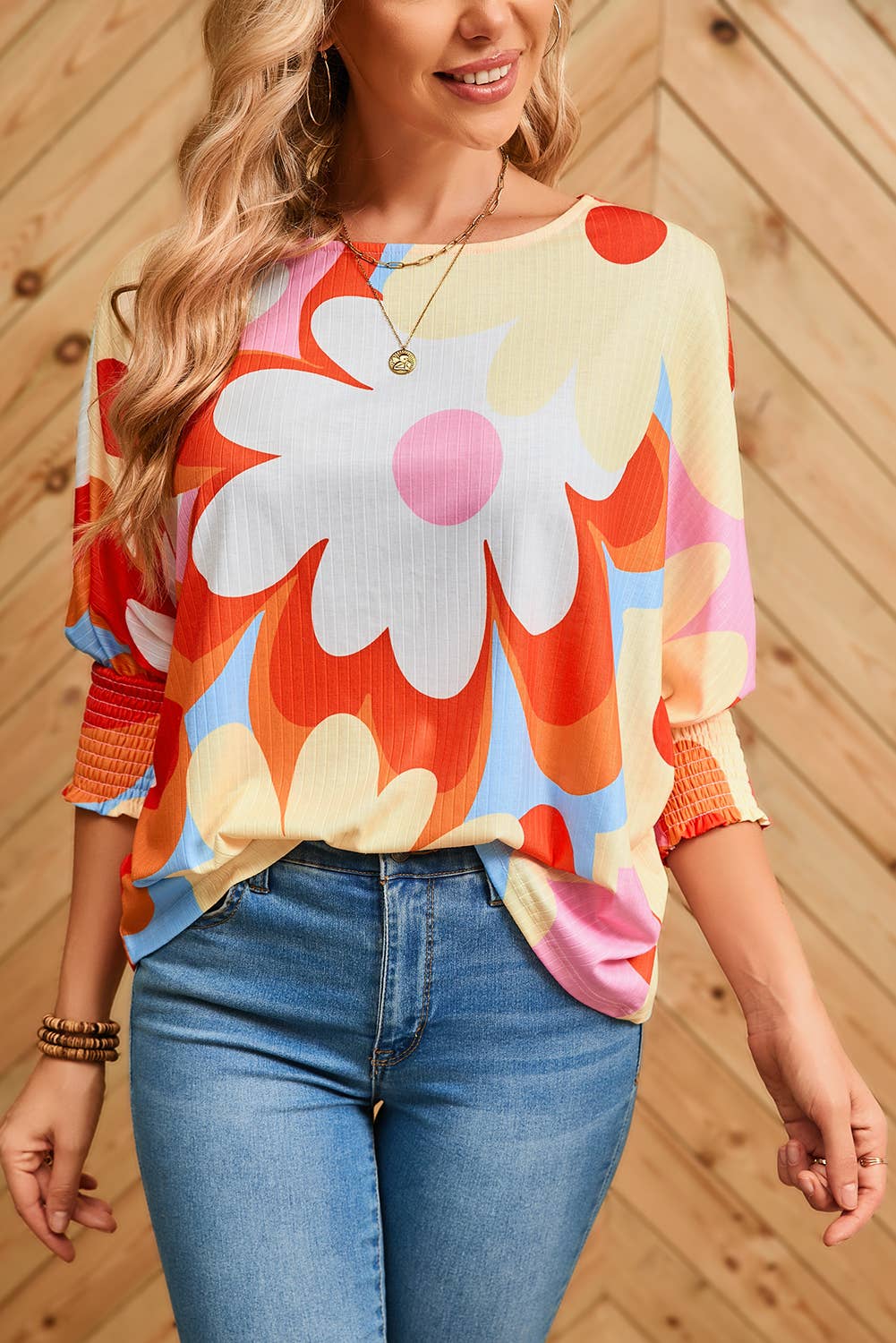 Women Big flower Print 3/4 Sleeve Top